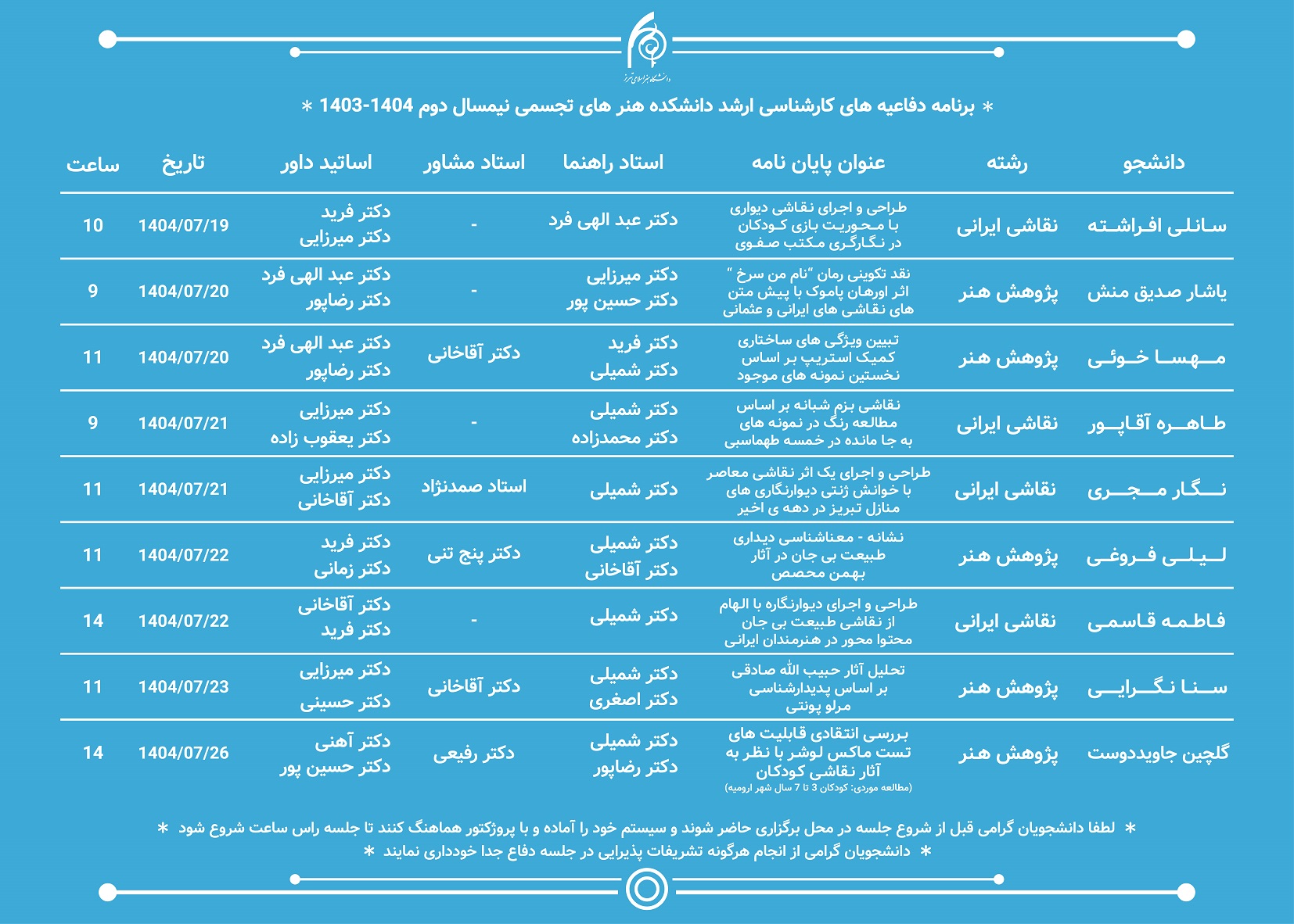 برنامه دفاعیه‌های کارشناسی ارشد